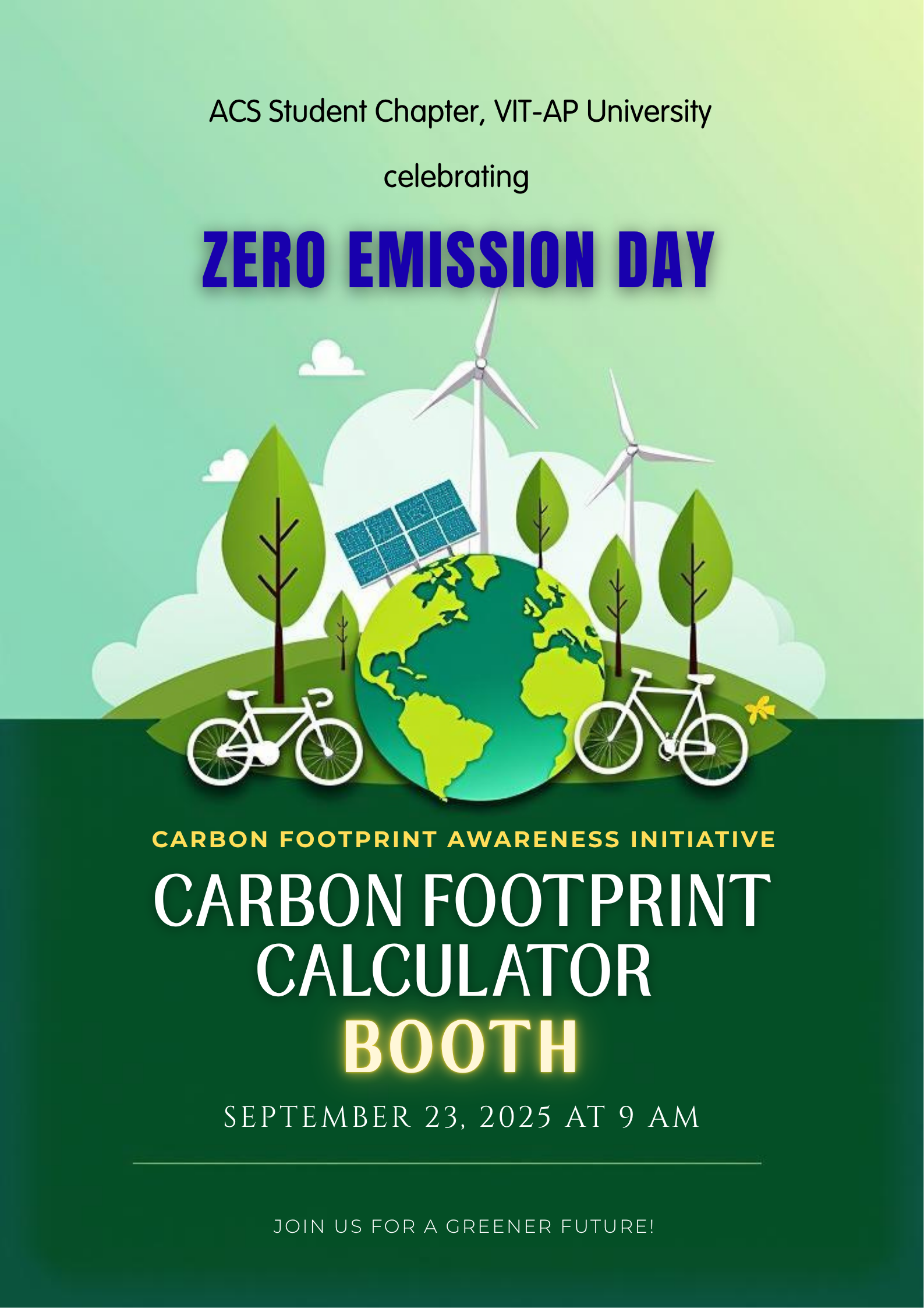 As part of the Zero Emission Day 2025 celebrations, the ACS Student Chapter of VIT-AP University organized a Carbon Footprint Calculator Booth. The booth aimed to provide students with an opportunity to understand their individual impact on the environment and to encourage them to adopt sustainable practices in their daily lives.